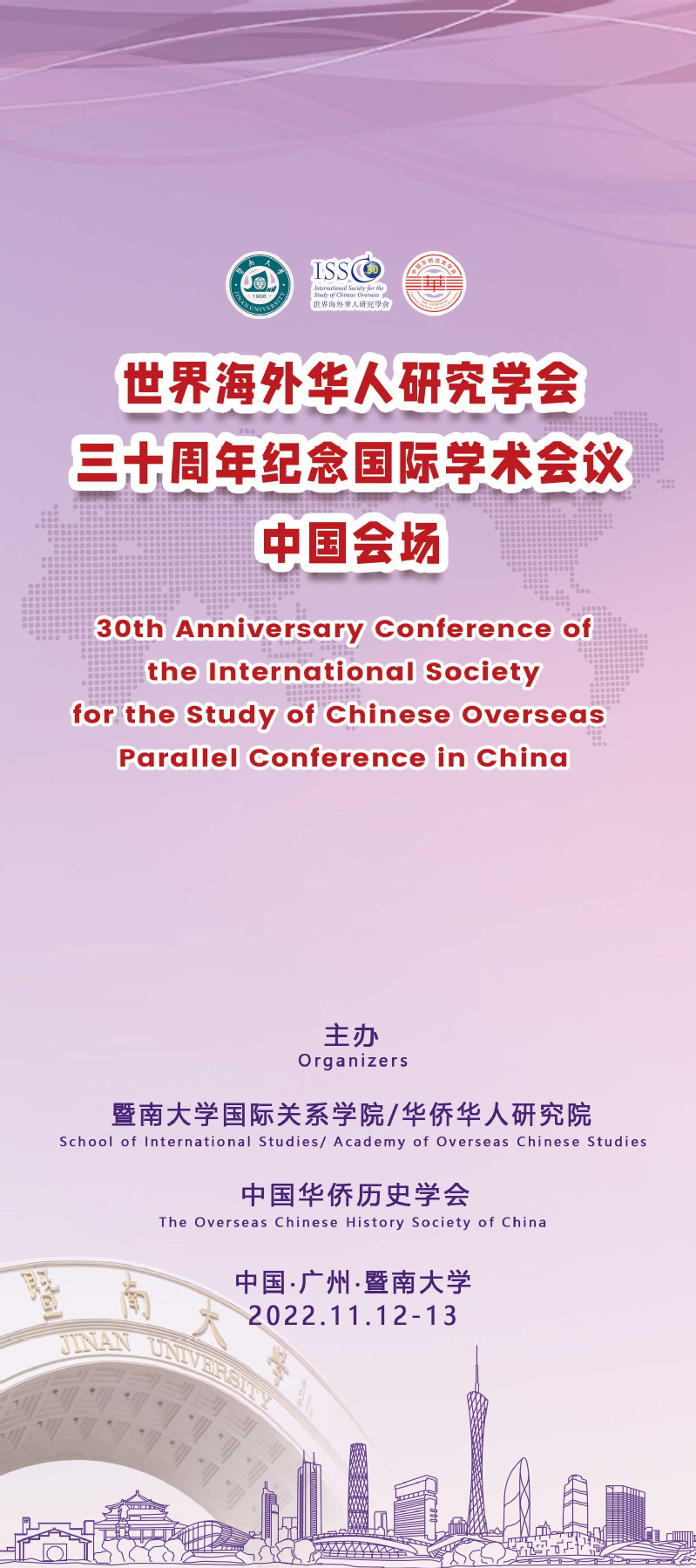 2022年,世界海外華人研究學(xué)會(huì)再次與暨南大學(xué)結(jié)緣,將學(xué)會(huì)三十周年紀(jì)念會(huì)議的中國平行論壇設(shè)立在我校,由我校國際關(guān)系學(xué)院/華僑華人研究院和中國華僑歷史學(xué)會(huì)聯(lián)合主辦。會(huì)議設(shè)有6個(gè)平行論壇、共計(jì)30個(gè)小組進(jìn)行主題發(fā)言。會(huì)議信息如下: