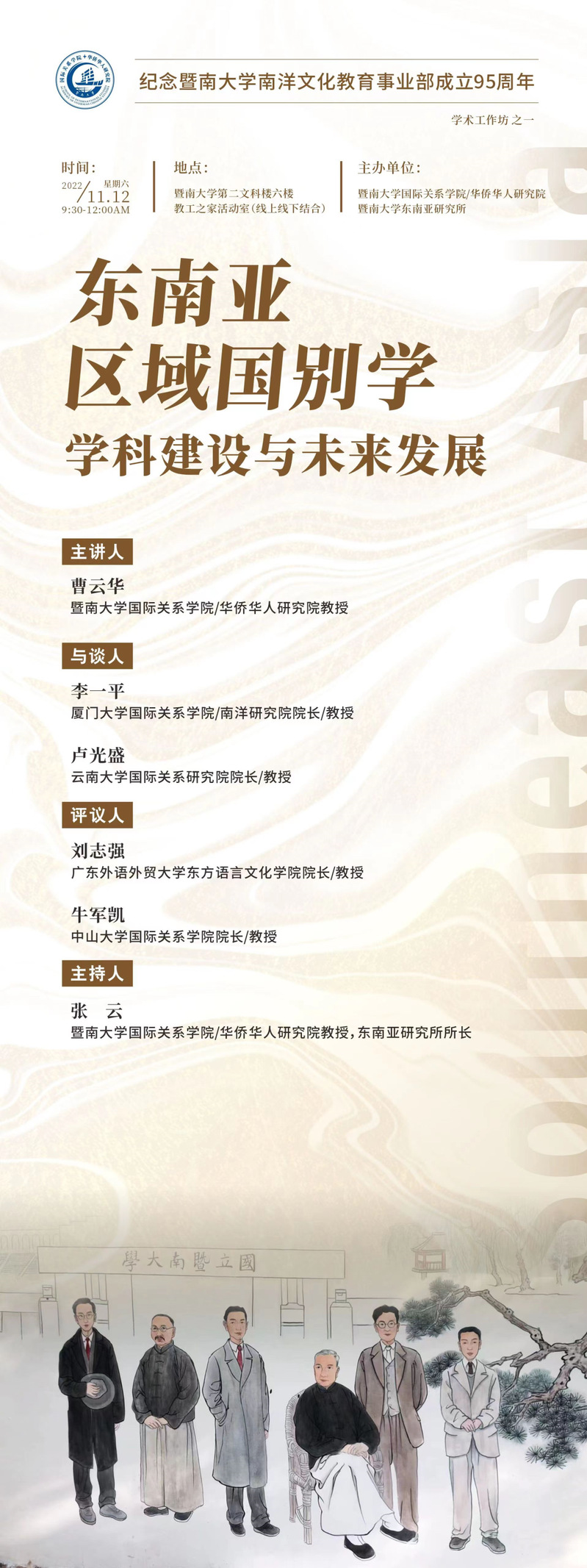 2022年是暨南大學(xué)南洋文化教育事業(yè)部成立95周年,適逢區(qū)域國(guó)別研究作為新興學(xué)科在國(guó)內(nèi)高校全面推進(jìn)之時(shí)。為交流學(xué)科建設(shè)經(jīng)驗(yàn),推動(dòng)?xùn)|南亞研究和華僑華人研究的進(jìn)一步發(fā)展,我校國(guó)際關(guān)系學(xué)院/華僑華人研究院將組織舉辦“紀(jì)念暨南大學(xué)南洋文化教育事業(yè)部成立95周年”系列學(xué)術(shù)活動(dòng),首期學(xué)術(shù)工作坊安排如下:
