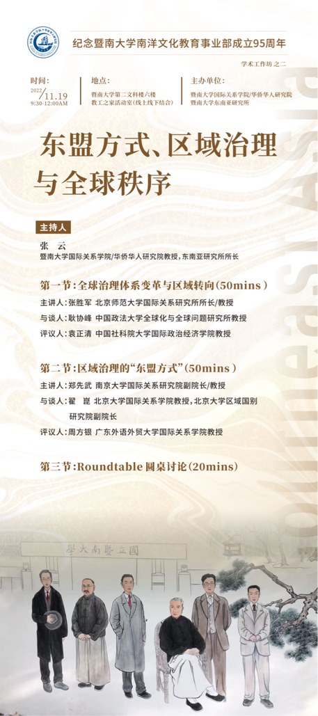 2022年是暨南大學(xué)南洋文化教育事業(yè)部成立95周年,適逢區(qū)域國(guó)別研究作為新興學(xué)科在國(guó)內(nèi)高校全面推進(jìn)之時(shí)。為交流學(xué)科建設(shè)經(jīng)驗(yàn),推動(dòng)?xùn)|南亞研究和華僑華人研究的進(jìn)一步發(fā)展,我校國(guó)際關(guān)系學(xué)院/華僑華人研究院將組織舉辦“紀(jì)念暨南大學(xué)南洋文化教育事業(yè)部成立95周年”系列學(xué)術(shù)活動(dòng),第二期學(xué)術(shù)工作坊安排如下: