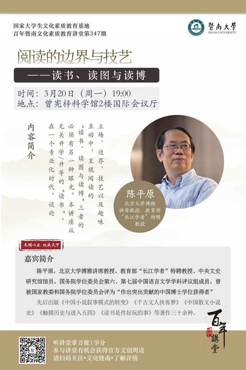 百年暨南文化素質(zhì)教育講堂第347期:陳平原:閱讀的邊界與技藝讀書(shū)、讀圖與讀博