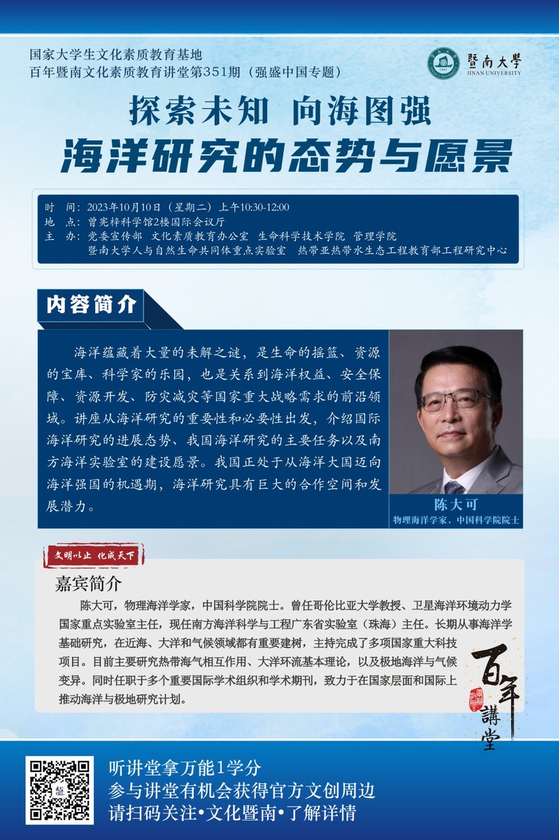 百年暨南文化素質(zhì)教育講堂第351期:陳大可:探索未知 向海圖強(qiáng)——海洋研究的態(tài)勢(shì)與愿景