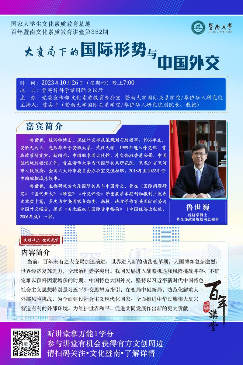 百年暨南文化素質(zhì)教育講堂第352期:魯世巍:大變局下的國際形勢與中國外交